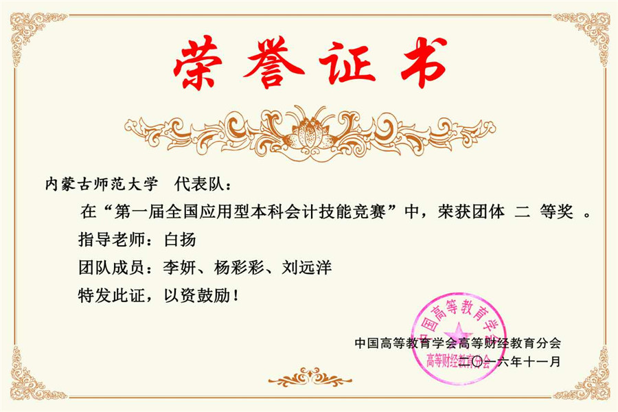 2016年11月5日,第一届全国应用型本科会计技能竞赛在江苏理工公司举行,由公司白扬老师带领的伟德国际1946代表队由13级会计专业李妍、14级会计专业杨彩彩、刘远洋三位选手组成。经过激烈的角逐,伟德国际1946代表队荣获团体二等奖,白扬老师获得优秀指导教师称号,三位参赛选手各自均获得会计手工帐一等奖,会计电算化二等奖的优异成绩。