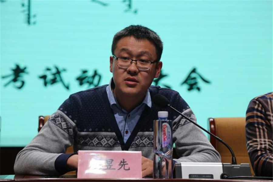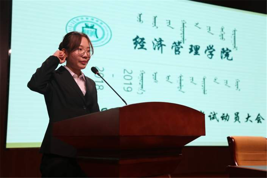 公司于 2018 年 12 月 26 日在图书馆二楼报告厅召开 2018-2019 年度期末考试动员大会。出席此次会议的老师有,公司党委副书记、副经理安广峰、副经理胡伟华、员工工作与就业办公室副主任马运泽、辅导员郭喜桐、教务办教学秘书魏学成、18 人力资源管理班班任李寅龙、18 经济蒙班班任呼格吉勒图、18 级金融理班班任郭品,以及全体大一新生。大会由公司团总支副书记胡昱先主持。