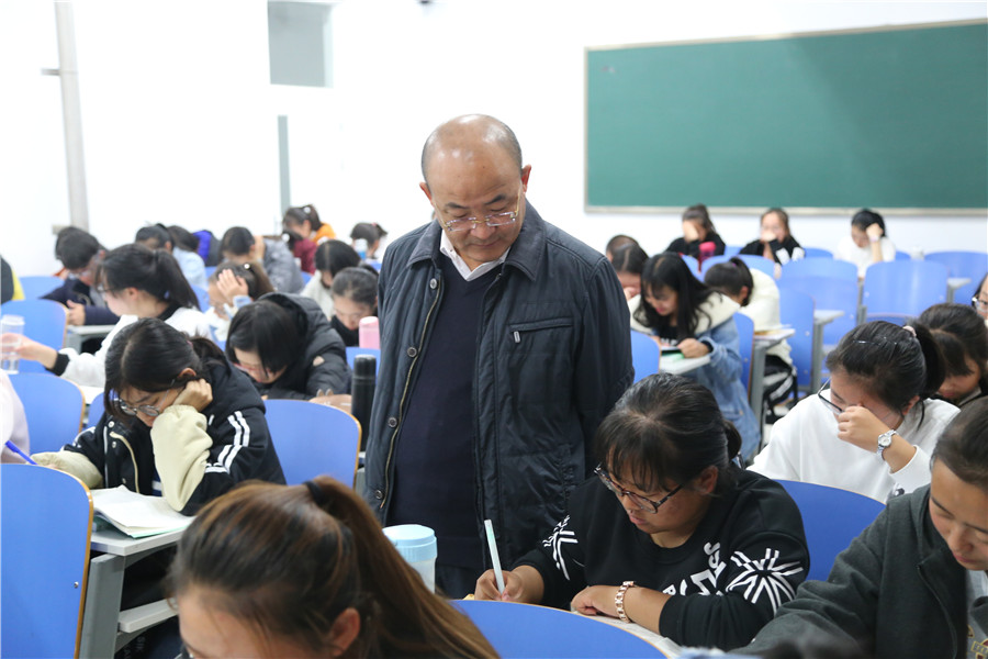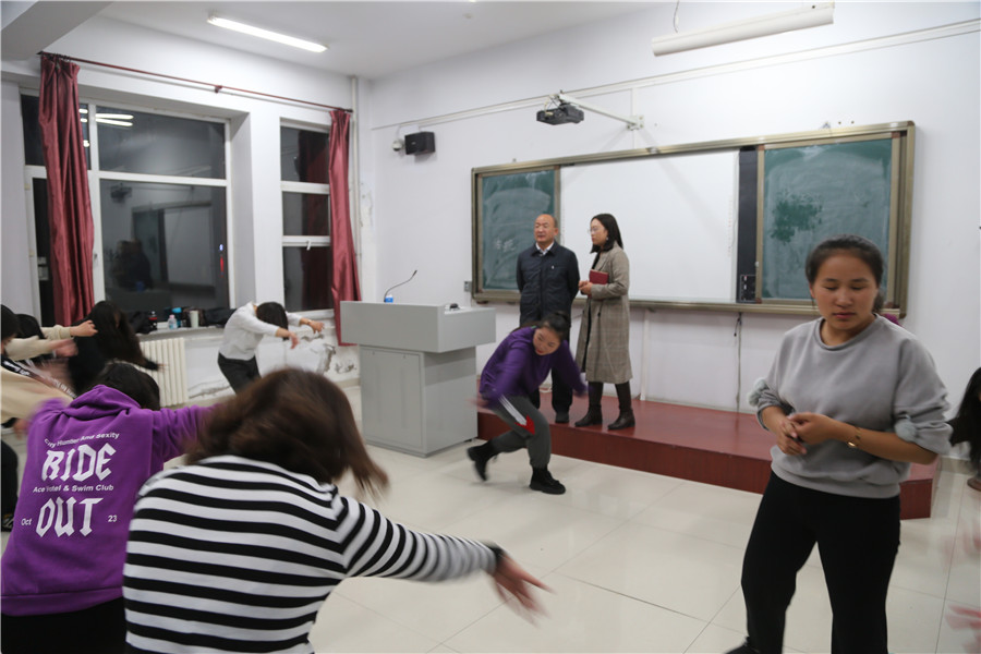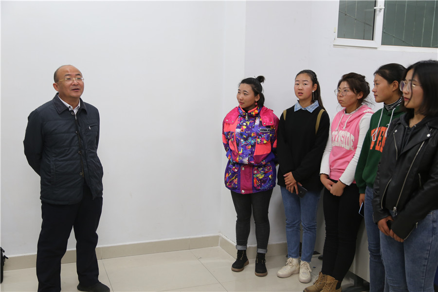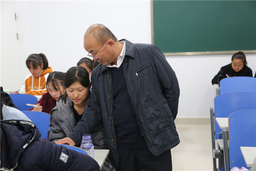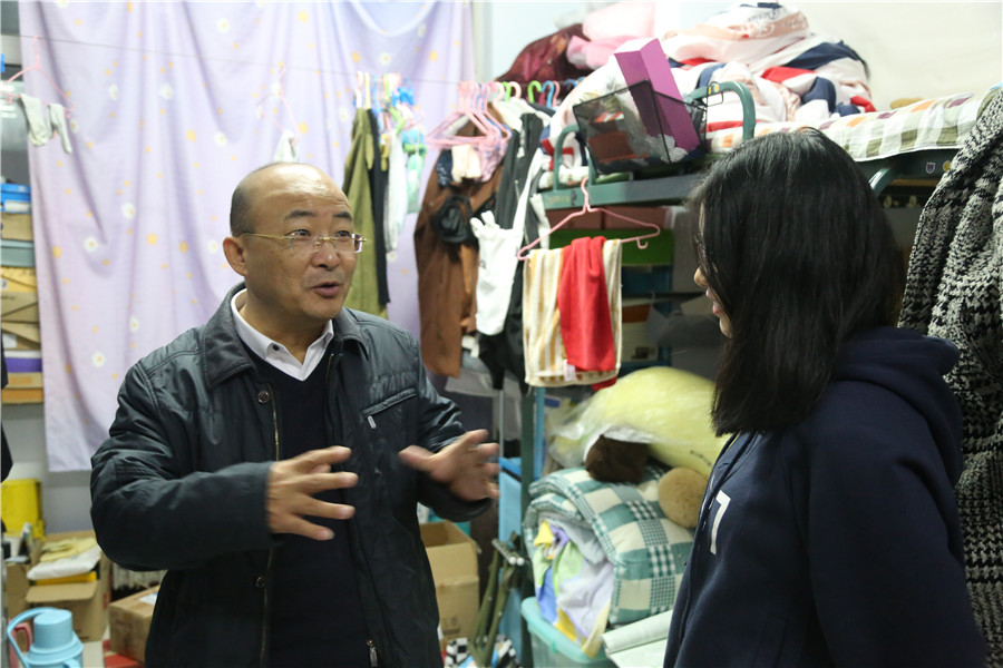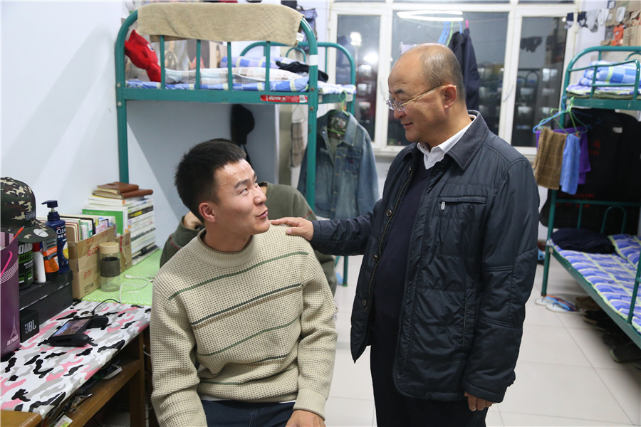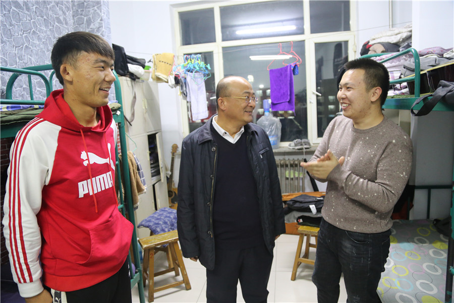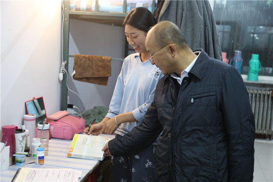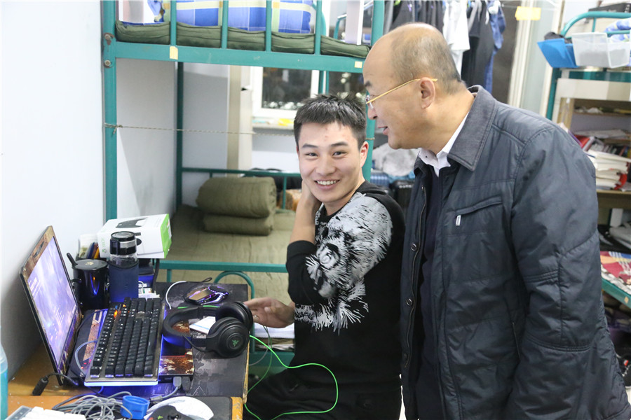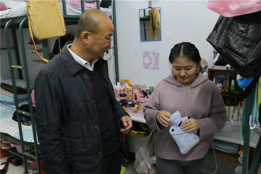 晚上,单老师来到自习室,了解新生自习情况,关心新生学习状况。走进教室,单老师拿起员工桌角的课本,关心的问到“最近学的怎么样,是否适应大学课程”。随后,单老师来到排练室同正在准备迎新晚会的员工互动交流,并对迎新节目排练提出期待、作出指导。单老师还不忘关心员工宿舍情况,带领员工会成员走进宿舍,了解员工宿舍供暖情况,以及其他生活问题。单老师与员工亲切交谈,单老师对同学们说“少玩游戏,好好学习”。同时,老师叮嘱同学们多添加衣物注意保暖。单老师与员工深入沟通,给身处异乡的孩子带来秋日温暖。