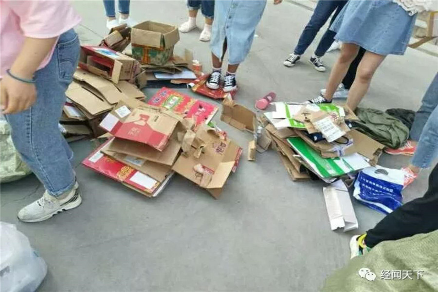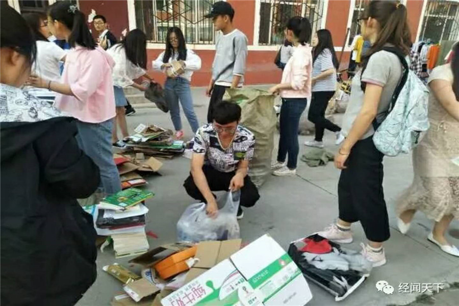 5月17日,经济公司绿·爱环保公益协会在10号宿舍楼前进行公益回收活动,全体社团成员以及活动参与者将回收到的塑料瓶等废旧物品整理分类,并利用收集到的废品换取了一定的社团公益资金。同学们在一起劳动,没有人抱怨,没有人喊累,一时间充满了欢声笑语。