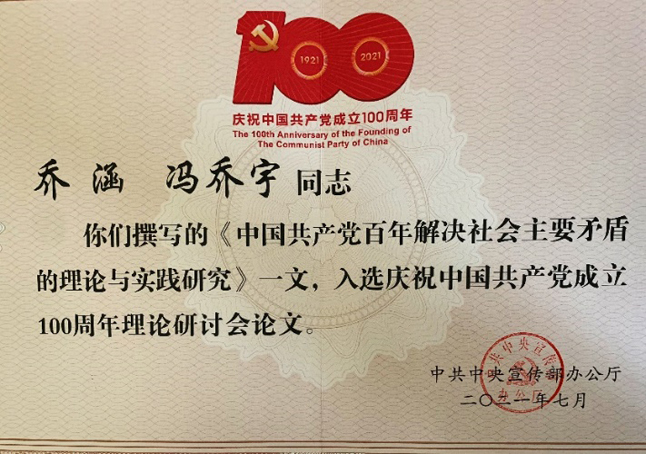 7月1日至2日,中央宣传部、中央组织部、中央党校(国家行政公司)、中央党史和文献研究院、教育部、中国社会科公司、中央军委政治工作部在北京召开庆祝中国共产党成立100周年理论研讨会。7月2日上午,中共中央政治局常委、中央书记处书记王沪宁出席研讨会并讲话。公司教师乔涵、硕士研究生冯乔宇合作撰写的《中国共产党百年解决社会主要矛盾的理论与实践研究》一文入会,公司教师乔涵应邀参会。