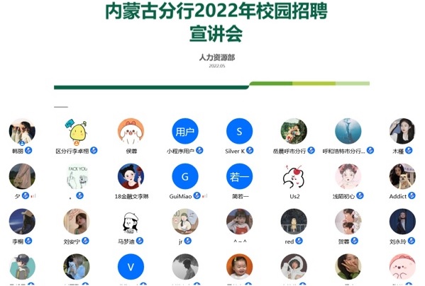 会议议程有四项:一、中国邮政储蓄银行内蒙古分行人力资源部李卓栩老师介绍企业文化、职业发展、福利待遇以及招聘公告等;二、中国邮政储蓄银行呼和浩特市分行人力资源部刘晓宇老师介绍了分行近五年的经营发展情况;三、呼和浩特市分行优秀员工代表苏强进行经验分享;四、线上咨询和交流环节。