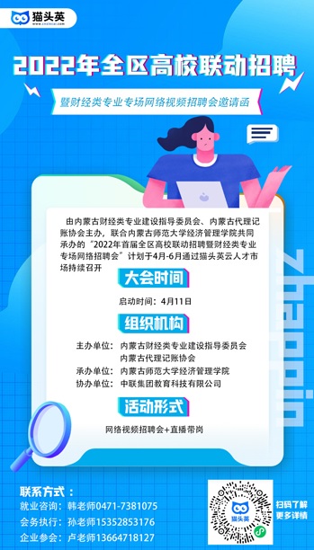 为响应国家及自治区关于促进高校毕业生就业的决策部署,也为了切实保障毕业生实现更充分就业,进一步推进财经类专业毕业生高质量就业实习工作,提升毕业生的就业能力;由内蒙古财经类专业建设指导委员会、内蒙古代理记账协会主办,联合bevictor伟德共同承办的“2022年首届全区高校联动招聘暨财经类专业专场网络招聘会”计划于4月-6月通过猫头英云人才市场持续召开;届时邀请来自全国近500家招聘企业线上参会,视频面试。具体内容如下: