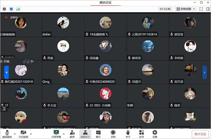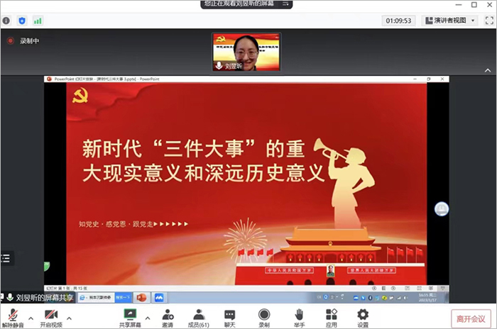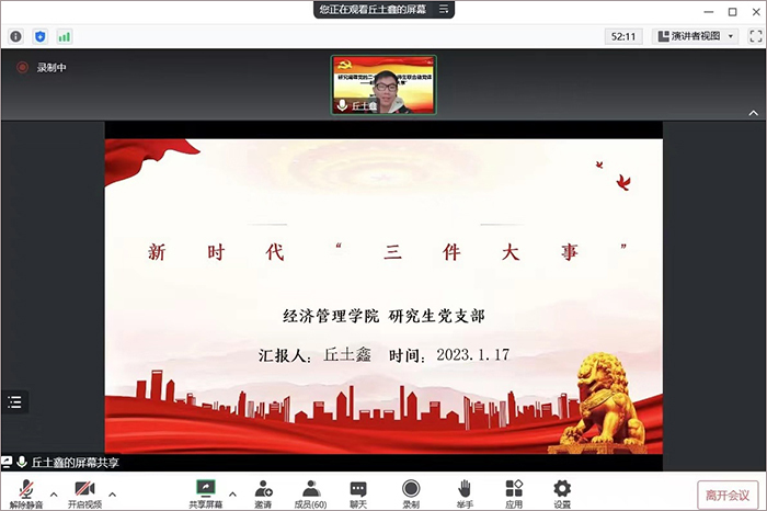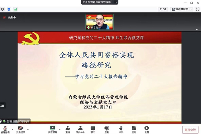 为持续深入学习贯彻党的二十大精神,经济与金融党支部联合研究生党支部、本科生第一党支部举办的“研究阐释党的二十大精神 师生联合微党课”主题党日活动第二期于2023年1月17日在线进行。第二期微党课主题是“新时代三件大事”,会议由乔涵主持,杨蕴丽、岳富贵、宝苏雅拉、苏雅拉等教师及60余名员工党员参加此次微党课学习。岳富贵、丘土鑫、刘昱昕担任本次微党课主讲嘉宾。