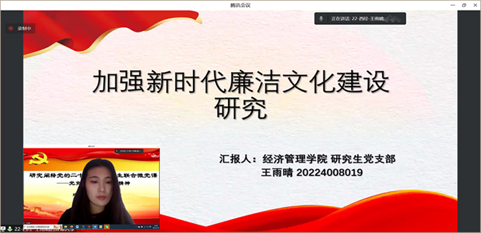 研究生党支部王雨晴,系统分析了习近平总书记加强廉洁文化建设的重要论述、党章党规的新规定,阐释了新时代加强廉洁文化建设的内涵与作用,并从夯实清正廉洁思想根基、发挥廉政教育基地作用、弘扬崇廉拒腐社会风尚等方面提出了对策建议。她把马克思主义基本原理同中国具体实际相结合、同中华优秀传统文化相结合的分析思路令大家耳目一新。