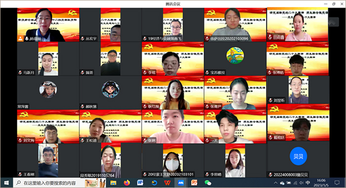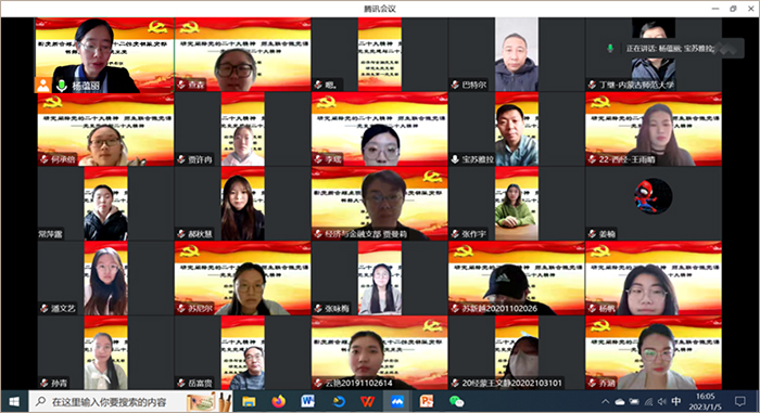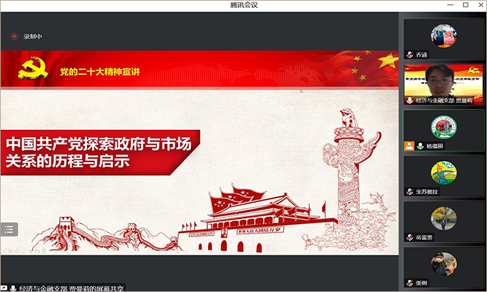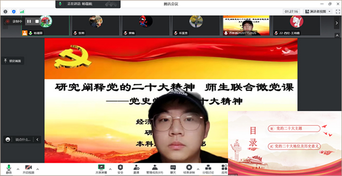 为深入研究阐释党的二十大精神,推动习近平新时代中国特色社会主义经济思想“入脑入心”,经济与金融党支部联合研究生党支部、本科生第一党支部举行“研究阐释党的二十大精神 师生联合微党课”系列主题党日活动。经过活动策划、拟定选题、分组创作等阶段,首期微党课于1月5日在线进行,主题是“党史党建与二十大精神”。首期微党课由杨蕴丽主持,特格西毕利格、姜楠、丁继、岳富贵、乔涵、宝苏雅拉、巴特尔等教师及63名员工党员和积极分子参加了微党课学习。贾曼莉、王雨晴、苏新越担任了本次主讲嘉宾。