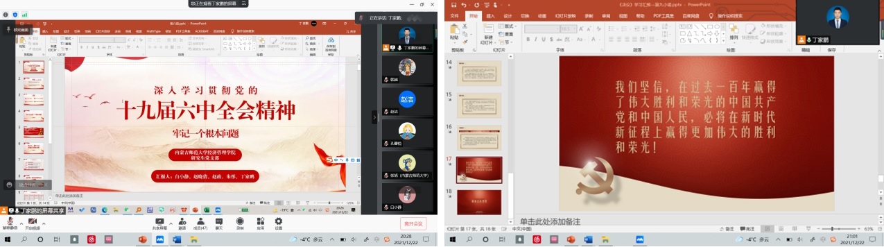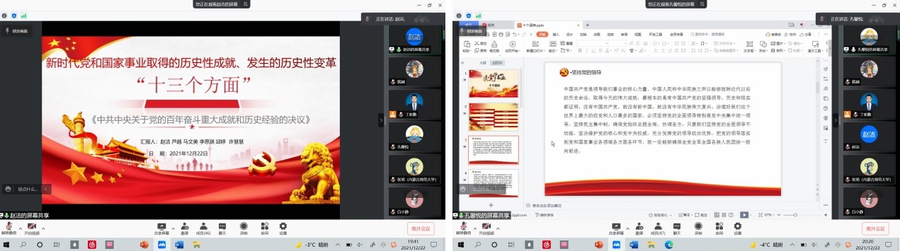 为深入学习贯彻党的十九届六中全会精神,认真领会《中共中央关于党的百年奋斗重大成就和历史经验的决议》丰富内涵,bevictor伟德研究生党支部于12月22日召开《中共中央关于党的百年奋斗重大成就和历史经验的决议》学习汇报大会。会议由研究生党支部书记乔涵主持,支部全体党员、党员发展对象、入党积极分子参加会议。