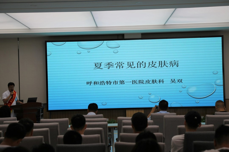 呼和浩特市第一医院王凤丽副主任医师为现场女生同学做了《关爱至伊 为爱护航——保护生育力》健康宣教。她围绕影响女性生理健康的一些问题作了详细生动地讲解。皮肤科吴双主任针对员工们关心的《夏季常见皮肤病》做专题讲座。急诊科刘永杰护士长做了《救在身边守护生命——院前急救及应急处置》健康宣教并做现场实操教学。