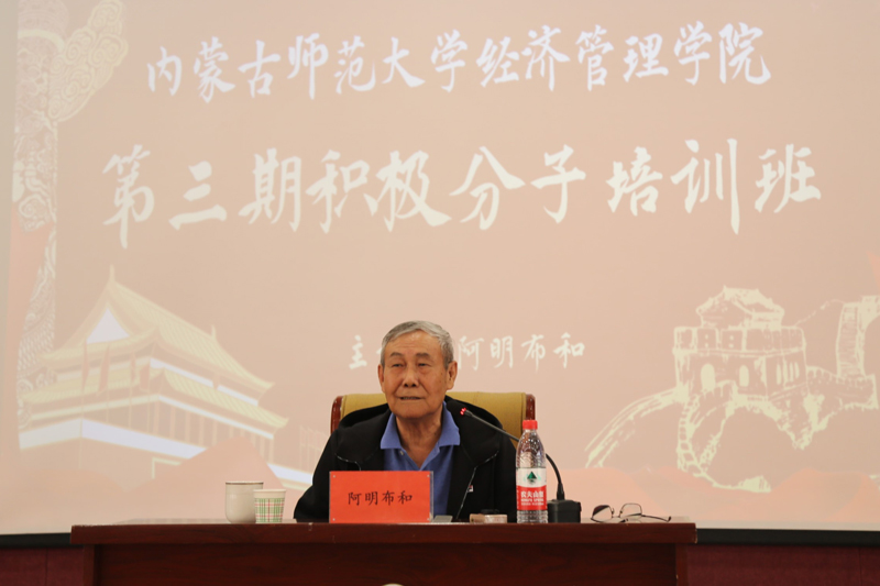 古稀之年的阿明布和教授以时间为序,将1919年至1949年这段时期划归了五个时期,分别为:中国共产党创建时期(1919年五四运动到1922年中国共产党二大的召开);大革命时期(1922年国共第一次合作至1927年4月12日反革命政变); 土地革命时期(1927年南昌起义至1937年西安事变);抗日战争时期(1937年至1945年);解放战争时期(1945年至1949年)。阿老师详尽描述了近百个革命历史人物,几十个历史事件,将整个新民主主义革命历史讲的脉络清晰,淋漓尽致,在场的广大师生的大为赞叹。讲座结束后,来自师生们发自内心的掌声经久不息。