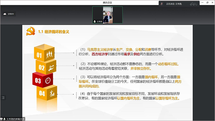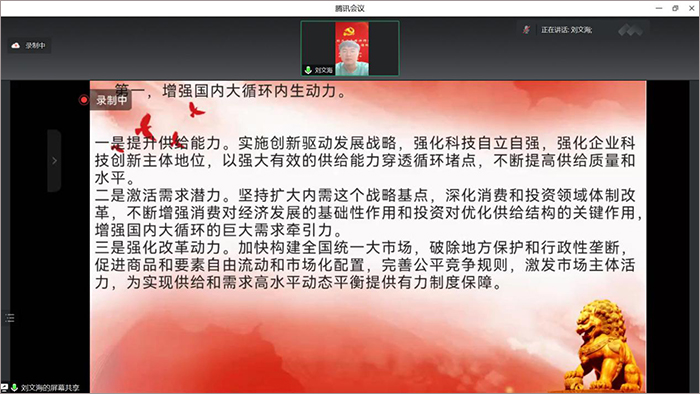 为深入学习贯彻党的二十大精神,经济与金融党支部联合研究生党支部、本科生第一党支部举办的“研究阐释党的二十大精神 师生联合微党课”主题党日活动第六期于2023年3月23日在线上举行。第六期微党课主题为“国内大循环”,会议由宝苏雅拉主持,王秀艳等教师及60余名员工党员参加本次微党课学习。王秀艳、刘文海、付焕担任本次微党课主讲嘉宾。
