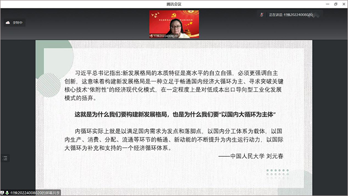 经济与金融党支部王秀艳,以“增强国内大循环内生动力和可靠性路径研究”为主题,详细介绍了国内大循环内生动力和可靠性的背景和内涵,并结合现有研究讲述了国内大循环所面临的新变化和难点,以及增强国内大循环内生动力和可靠性的关键路径。