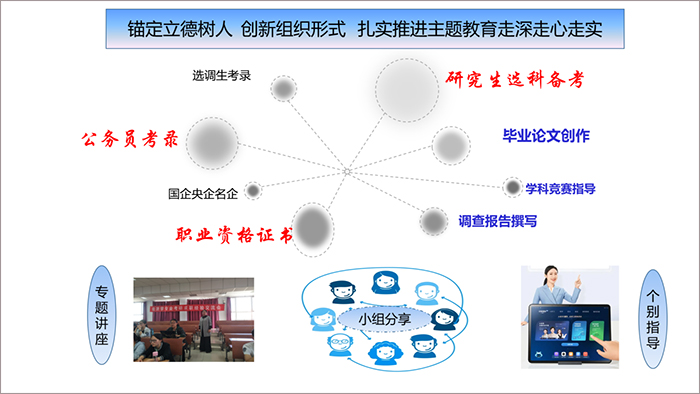 5月25日,党支部委员会重点研究如何“创新形式 扎实推进主题教育走深走心走实”。贾曼莉建议为员工开展论文选题指导讲座,包秀琴建议开展考研指导讲座,杨蕴丽建议每个党员领衔一个专题,围绕调查报告撰写、学科竞赛指导、毕业论文创作、研究生选科备考、职业资格证考试、公务员考录、选调生考录、应聘国企央企等员工关切问题,通过“学用新思想 建功新时代”系列主题党日发挥党建助研助学助教功能,构建“专题讲座+小组分享+个别指导”相结合的专业素养拓展机制,不断提升一流人才培养质量。