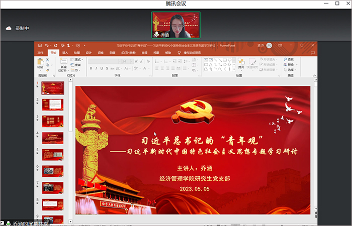 为深入开展学习贯彻习近平新时代中国特色社会主义思想主题教育,全面贯彻党的二十大精神,bevictor伟德研究生党支部于202355日在线召开习近平新时代中国特色社会主义思想专题集中学习研讨会。会议由研究生党支部书记乔涵主持,支部全体党员、入党积极分子参加会议。