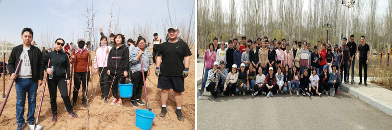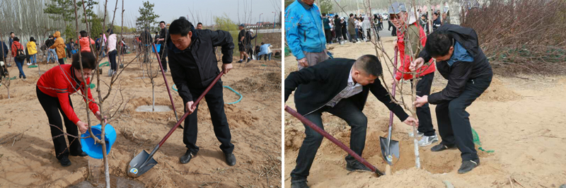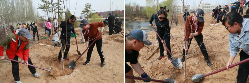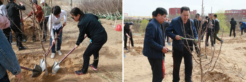 4月18日上午公司党委书记包凤兰、副经理胡伟华,辅导员郭喜桐、芦嘉琛、郑晓东以及170余名员工与公司党委书记黄雅丽等党政领导在盛乐校区一同进行了植树造林活动。