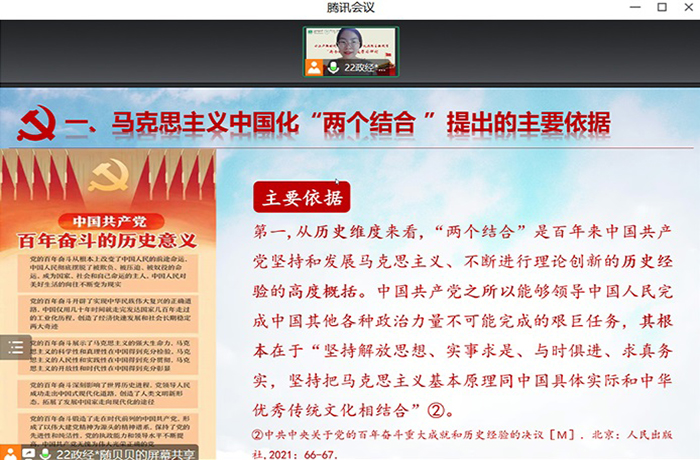 其次,支部党员随贝贝同志以《“两个结合”的提出依据、科学内涵与实践路径》为题主讲了党课,主要从“两个结合”提出的理论和现实依据、科学内涵和实践路径三个方面展开论述。