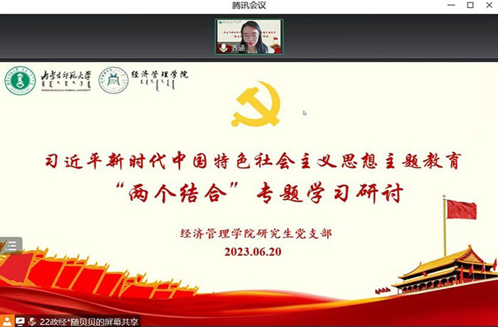 为深入开展学习贯彻习近平新时代中国特色社会主义思想主题教育,bevictor伟德研究生党支部于2023年6月20日召开习近平新时代中国特色社会主义思想主题教育——“两个结合”专题学习研讨会。会议由支部书记乔涵主持,支部全体党员、党员发展对象、入党积极分子参加会议。