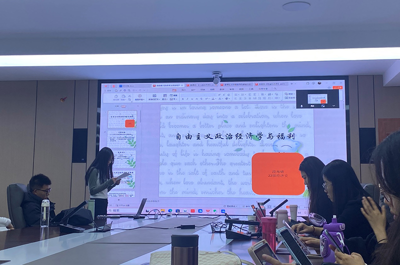 此次读书分享会由23级西方经济学专业研究生郝素莉同学主持。首先分享的是22级经济史专业研究生段海啸同学,分享的书目是《自由主义政治经济学与福利》,参考了诺曼·巴里的《福利》、陈红霞的《社会福利思想》、陈银娥与潘胜文的《社会福利》。这本书梳理了自由主义政治经济学发展脉络,对比研究了古典政治经济学社会福利思想,分析了福利经济学与自由政治经济学的关系。