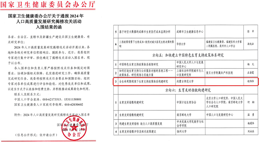 近日,国家卫生健康委员会办公厅公布了2024年人口高质量发展研究揭榜攻关活动入围名单。经过专家评审,围绕13个攻关方向共有74个研究项目入围。公司胡伟华教授团队提交的攻关任务《全生命周期视角下生育支持政策体系构建研究》成功入围,是自治区唯一入围此次揭榜攻关活动的研究项目。研究团队将严格按照攻关任务和研究时限,扎实推进研究工作,高质量完成攻关任务。