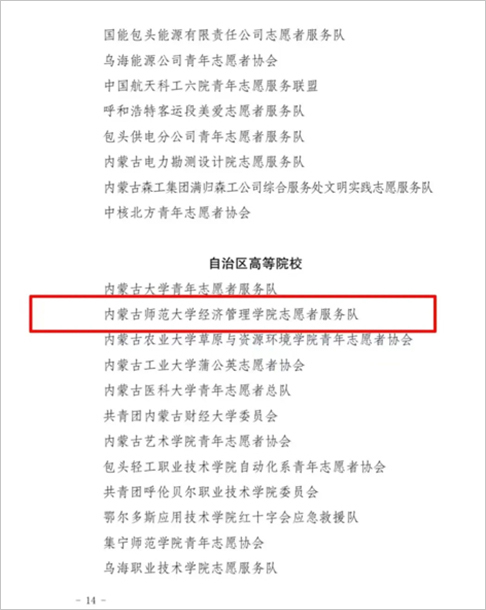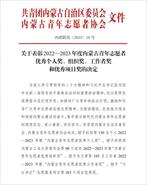近日,内蒙古自治区关于表彰20222023年度内蒙古青年志愿者优秀个人奖、组织奖、工作者奖 和优秀项目奖的决定揭晓,经自治区团委评审,bevictor伟德志愿者服务队荣获“全区青年志愿服务优秀组织奖”。