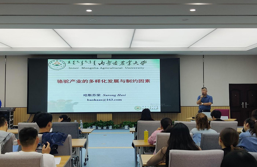 哈斯苏荣教授结合自身在比利时鲁汶大学、法国巴黎LCH实验室和美国德州农工大学博士后研究和访问学、后期的研究经历,介绍了骆驼进化与发展史、骆驼的独特性;由骆驼的独特性分析了骆驼产业多元化发展,包括骆驼产品的多元化,如骆驼奶制品、驼绒、驼骨和驼肉;骆驼文化节所蕴含的商机与文化传承,应该大力发展创新,充分发挥骆驼在旅游业中的作用。哈斯苏荣教授结合阿拉善盟独特的地理和气候特点,分析了骆驼产业在阿拉善盟特别是阿拉善右旗发展的前景和制约因素,认为阿拉善的自然地理特点和阿拉善独特的文化有利于双峰驼的可持续发展和骆驼产业链延伸。打造骆驼产业特色县域经济是阿拉善右旗的现实选择。