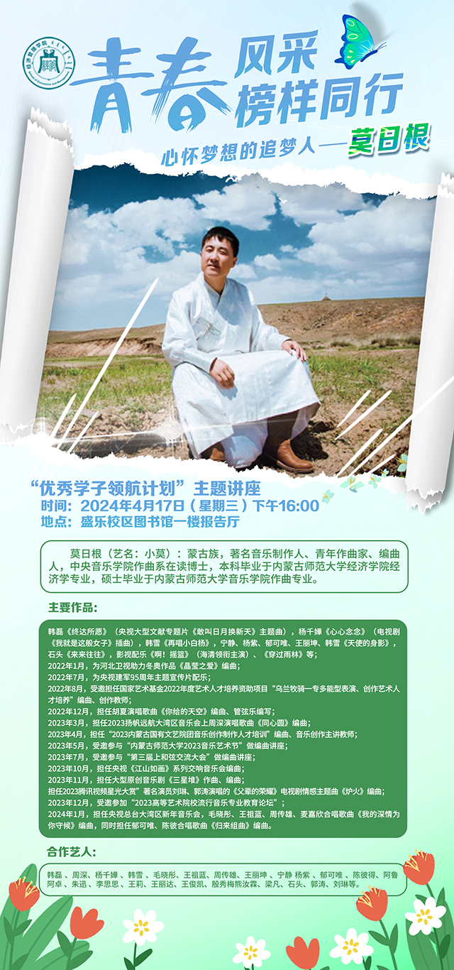 本次活动邀请的主讲嘉宾是公司2011届优秀毕业生莫日根。莫日根讲述了他从经济学专业跨音乐专业追寻音乐梦想的职业道路,通过结合自身学习经历鼓励同学们,除了完成本专业学习以外,也要勇敢追求梦想。他播放了自己作曲、编曲的四首作品,为同学们讲述了每一首作品制作背后的心路历程。他说,无论任何专业和行业最终成功的道理都是一样的,要学会做人做事,尊重老师,不走捷径,踏实耕耘,只要每天都在努力耕耘,相信总有一天会收获满满。