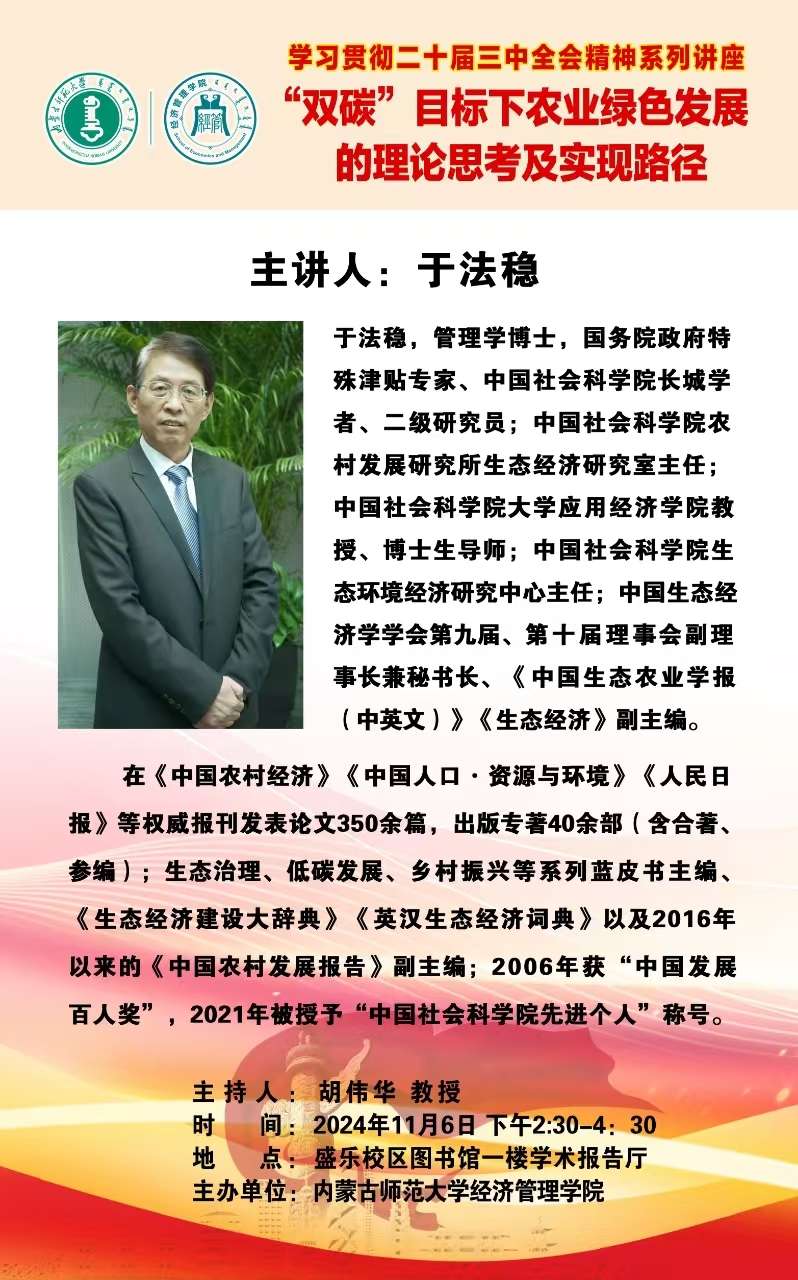 为深入学习贯彻习近平新时代中国特色社会主义思想和党的二十届三中全会精神,11月6日下午,公司邀请中国社会科学经理城学者、国务院政府特殊津贴专家、二级研究员于法稳作了题为“‘双碳’目标下农业绿色发展的理论思考及实现路径”的学术报告。公司领导班子、全体教师及研究生、本科生聆听了讲座。学术报告由公司副经理胡伟华教授主持。