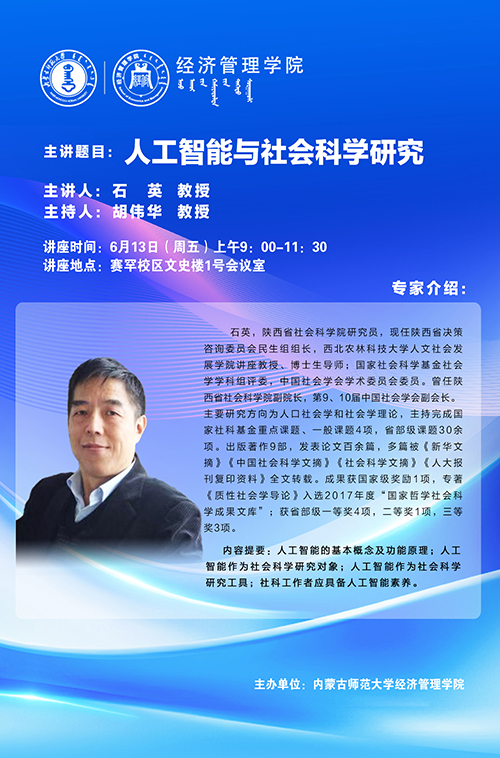 为深化对人工智能时代社会科学研究范式变革的理解,推动学科交叉融合,公司于6月13日上午成功举办了《人工智能与社会科学研究》专题学术讲座。本次讲座特邀陕西省社会科公司研究员、西北农林科技大学人文社会发展公司讲座教授、博士生导师石英担任主讲,公司党委书记智如水、全体教师、全体研究生参加了讲座。讲座由胡伟华教授主持。