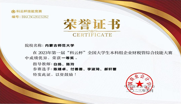 2023年5 月20 日,由中国商业会计学会主办、厦门科云信息科技有限公司承办的2023年“科云杯”全国老员工本科组企业财税管综合技能大赛在云端成功举办。本届大赛历时2个多月,经过校内赛的激烈选拔,全国近三百所高校、484支队伍报名参赛,由公司白扬、陈玲老师指导,陈靖卓、付善善、李淑琦、郝轩蕾四位同学组成的参赛代表队经过激烈角逐,喜夺一等奖的好成绩。