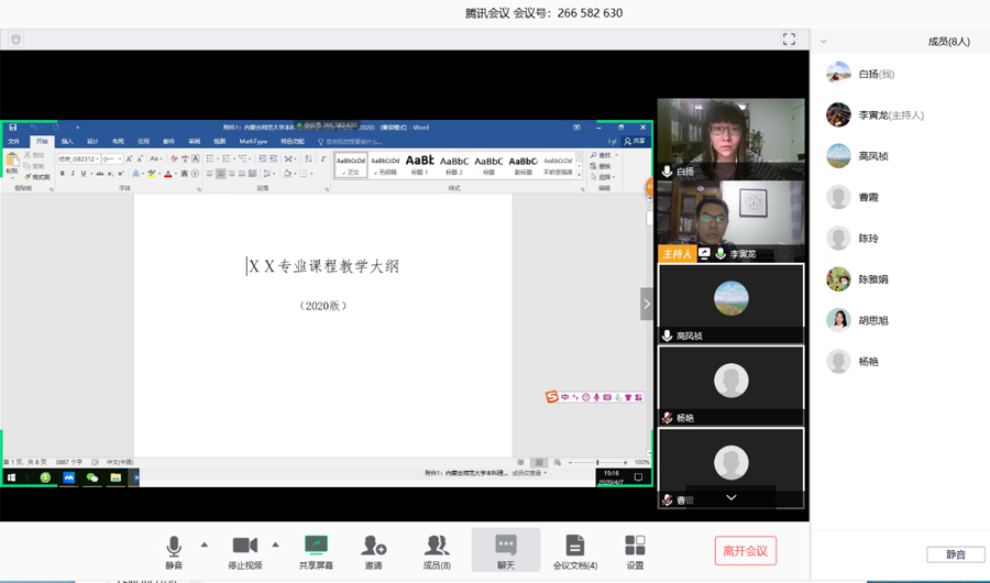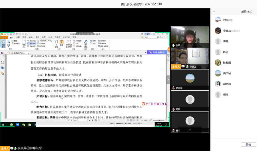 2020年4月7日晚19:00,财会系开展了教学大纲修订工作视频会议,会议由副系主任李寅龙老师主持,全系8名教师全部参加。本次会议深入学习了2020版本科生培养方案课程教学大纲修订工作的相关要求,并结合本系专业特点进行了充分探讨与沟通。通过屏幕共享的方式,李寅龙老师带领全系教师学习了《关于2020版本科生培养方案课程教学大纲编制(修订)工作的通知》、《伟德国际1946本科理论课程大纲参考模板》等指导性文件,重点强调了此次教学大纲修订的意义、重点注意事项以及时间安排。