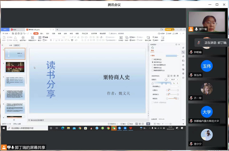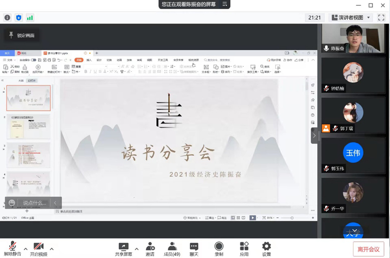 3月24日下午三点,bevictor伟德通过腾讯会议在线开展了“开卷有益,阅享经典”2022年第一期读书分享会,本期读书分享会由2021级经济史专业研究生郭丁瑞同学主持,研一研二全体研究生参加此次读书分享会。本次分享的五位同学对其分享的书籍进行了简要的概括,突出重点内容,激发了同学们对相关内容的探讨。