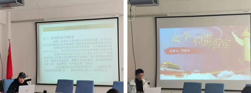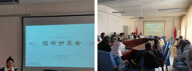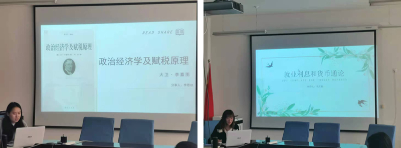 20级政治经济学专业的邓道兴、李思琪、马文美、芦越、杨陆杰和邱婷同学向大家分享了《两个不能否定》、《政治经济学及赋税原理》、《就业利息和货币通论》、《英国状况——评托马斯•卡莱尔的<过去和现在>》、《联共(布)党史简明教程》和《雇佣劳动和资本》等关于政治经济学的著作,不仅向同学们讲解了关于政治经济学的专业知识,还结合这些知识从专业的角度讲述了我国的相关政策,在分享过程中分享人都极具专业性,使得同学们收获颇丰。