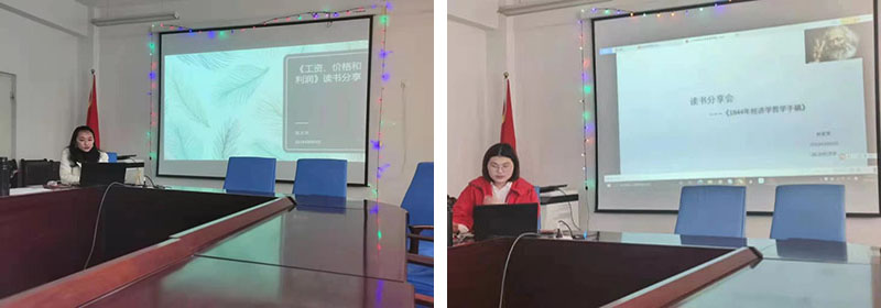 在本次读书分享会中,19级政治经济学专业的林笑笑、廖碧莹、薛文杰同学依次分享了《1844年经济学哲学手稿》《共产党宣言》和《工资、价格和利润》三本马克思著作,向同学们讲解了马克思早期的一些思想观点,让其他专业的同学们感受到了马克思主义政治经济学的魅力,为此次读书分享会烘托了浓重的学术氛围。