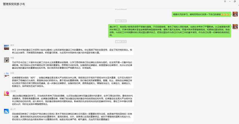 为深入开展党纪学习教育,进一步提升全体党员干部的纪律观念和规矩意识。4月18日,管理系党支部召开党纪学习教育学习交流会。会议由支部书记贾曼莉主持,支部全体党员参加。